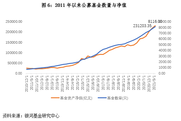 公募基金是最具代表性的资管产品。资管新规以后,相对于其他资管产品的“三去”压力,公募基金完全没有存量包袱,总体规模更是持续上扬,见图6。2018年底,注册制与科创板的试点开启新一轮股票市场的慢牛行情。受益于一二级市场行情的推动,2019年以来公募基金规模快速增长。