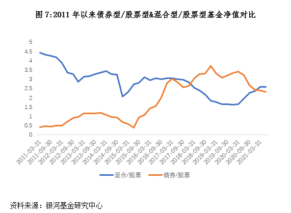 尽管近年来股市火爆,混合型基金与债券型基金交替领先才是公募基金的最大特点。相比股票型基金,混合型和债券型基金明显占主流。特别是债券型基金后来居上超越股票型基金,除在2014-2015年牛市期间,债券型净值与份额短暂落后于股票型,在大多数情况下,债券型与混合型基金的净值与份额都远远超过股票型基金,见图7。