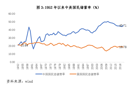 目前我国已经迈入中高等收入国家,老龄化社会提前到来,经济发展正在从投资主导型向消费主导型转变。长期来看,国内储蓄率下降是必然趋势。再加上个人投资渠道不断多元化,近年来居民储蓄增长速度同比持续下降。对比中美两国相关数据也可以得出类似结论。美国社会已进入后工业化消费时代,国民储蓄率在20%左右,中国则是45%左右。目前两国的国民储蓄率差距大约在25个百分点(见图3)。国内居民储蓄增速下降趋势符合国际经验对比。