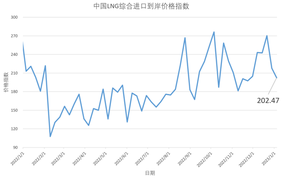 2022年12月26日-2023年1月1日中国LNG综合进口到岸价格指数为202.47 环比下跌7.11%