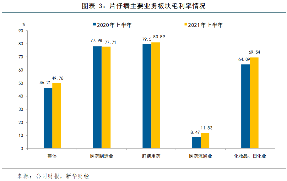 主要业务板块、主要市场保持良好发展态势。分行业来看,上半年公司医药制造业营收18.32亿元,同比增长31.29%,毛利率77.71%,保持稳定。此外,医药流通业和化妆品、日化业营收分别为15.55亿元、4.32亿元,毛利率分别为11.83%、69.54%,同比有明显提升。分地区来看,公司华东、华南市场稳健增长,东北、华北等区域更是增长迅猛,上半年同比增幅高达78.51%和53.37%。