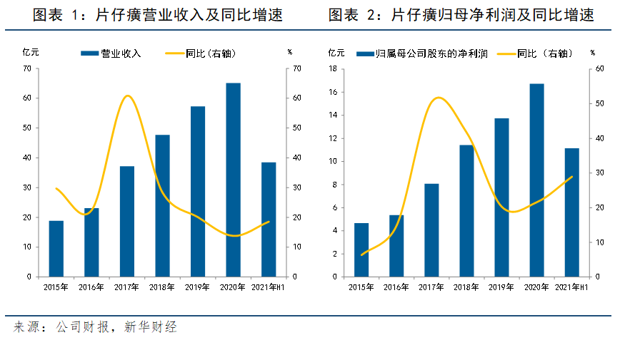 片仔癀2021年半年报显示,上半年公司实现营业总收入38.49亿元,同比增长18.56%,归母净利润11.15亿元,同比增长28.96%;扣非归母净利润11.15亿元,同比增长29.92%;基本每股收益(EPS)1.85元,同比增长29.37%。其中Q1单季度营收20.02亿元,同比增长16.76%,归母净利润5.65亿元,同比增长20.84%;Q2单季度营收18.47亿元,同比增长20.57%,归母净利润5.5亿元,同比增长38.54%,业绩呈逐季度加速态势。