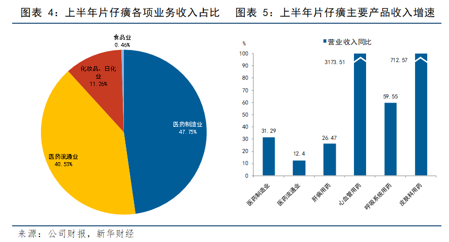 核心产品强劲增长,贡献主要业绩,同时在医药制造领域快速推进“一核多品”战略,成效明显。上半年公司医药制造业营收达18.32亿元,同比增长31.29%。其中,以片仔癀系列为主的肝病用药产品营收占比93%,达17.08亿元,同比增长26.47%,毛利率80.89%,同比提高1.39个百分点。同时,公司加快核心产品二次开发,持续做大做强复方片仔癀含片、复方片仔癀软膏、复方片仔癀痔疮软膏、茵胆平肝胶囊、心舒宝片、增乳膏、川贝清肺糖浆、清热止咳颗粒、少林正骨精、藿香正气胶囊、小儿止咳糖浆等系列产品,涵盖了肝病用药、感冒用药、心血管用药、呼吸系统用药、皮肤科用药等多个领域。上半年,公司心血管用药营收同比增长32倍,皮肤科用药同比增长7倍,呼吸科系统用药同比增长60%。此外,公司近年来积极布局经典名方,丰富产品线。2020年7月,片仔癀出资控股龙辉药业51%股权后获得安宫牛黄丸、西黄丸、参龟补肾口服液等中药配方,其中片仔癀牌安宫牛黄丸已成功推向市场。